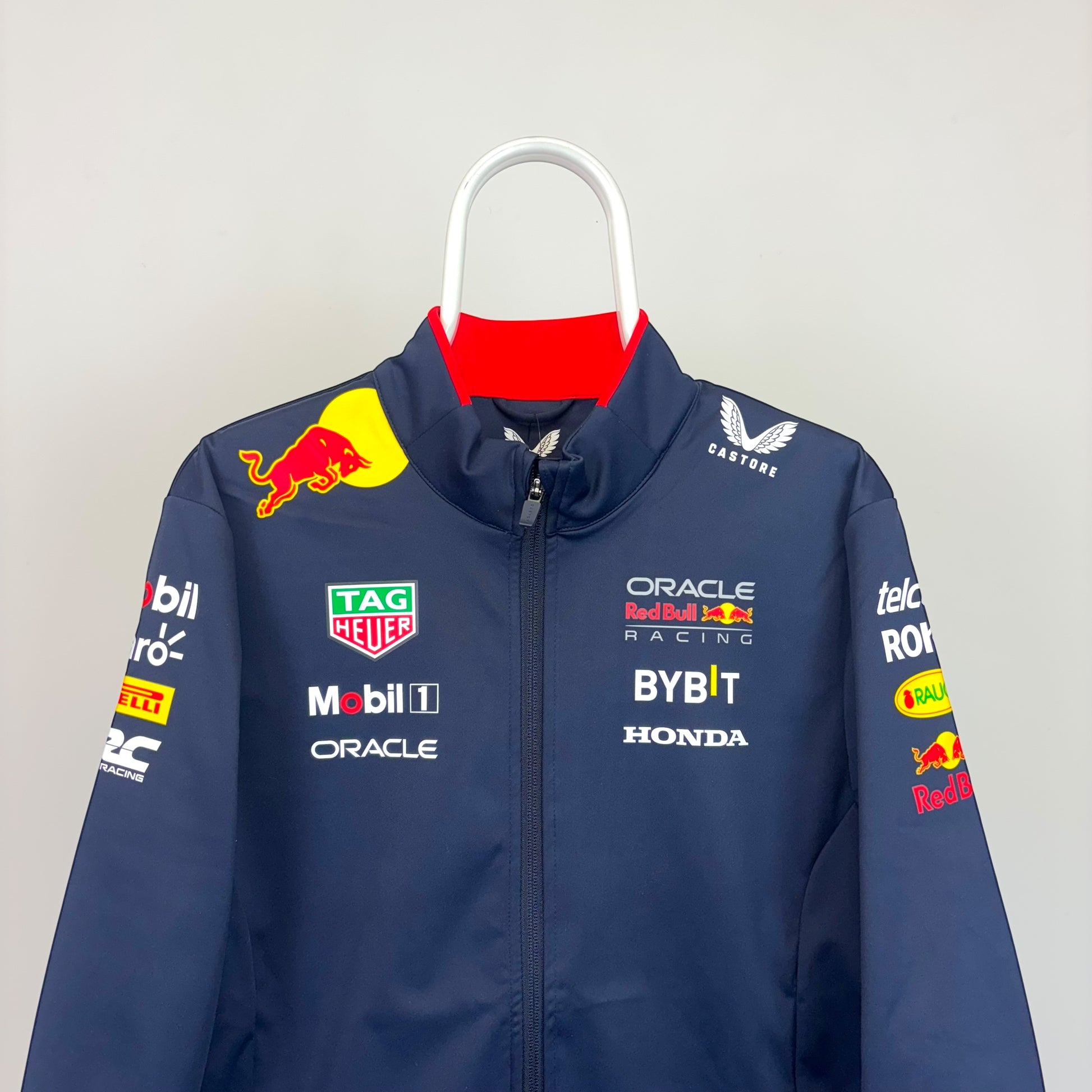 Embody the precision and performance of Formula 1 with the Red Bull Racing Soft Shell Jacket by Castore. Presented in sleek navy blue, this jacket features full sponsor prints and a clean full-zip design that mirrors the team’s professional edge. A staple for fans of Red Bull Racing, it celebrates a legacy of innovation, teamwork, and championship spirit that has defined their dominance on the grid. Whether trackside or on the go, this jacket brings the essence of F1 excellence into everyday style.