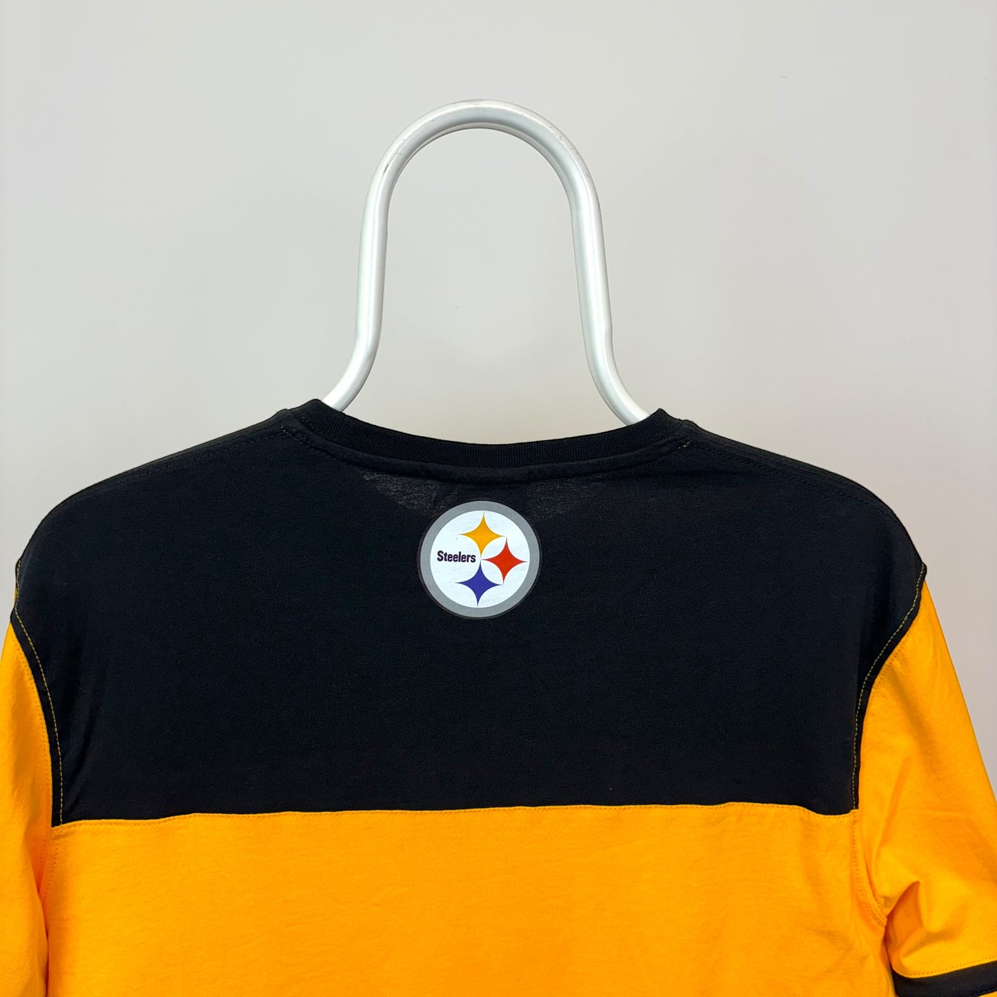 - "Pittsburgh Steelers" Wordmark Across the Black Panel: The bold "Pittsburgh Steelers" wordmark, printed across the yellow panel, creates a powerful and eye-catching statement.