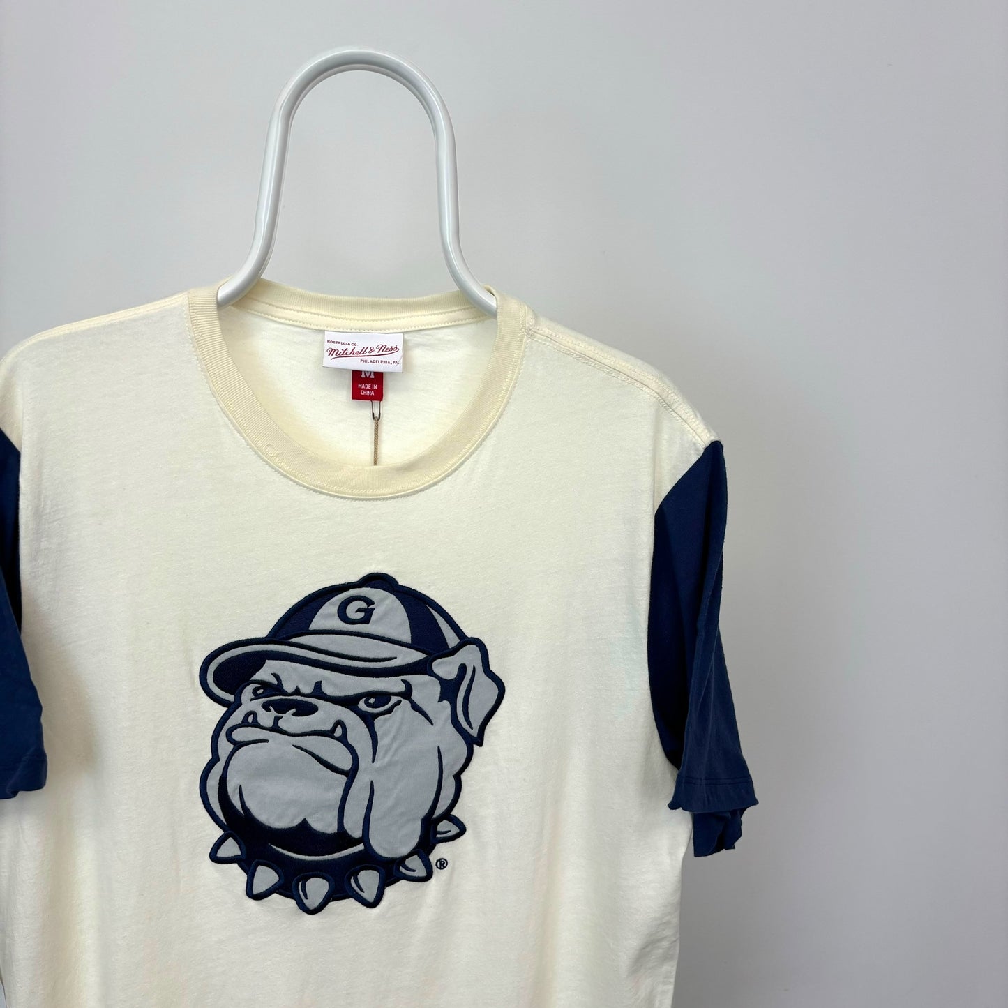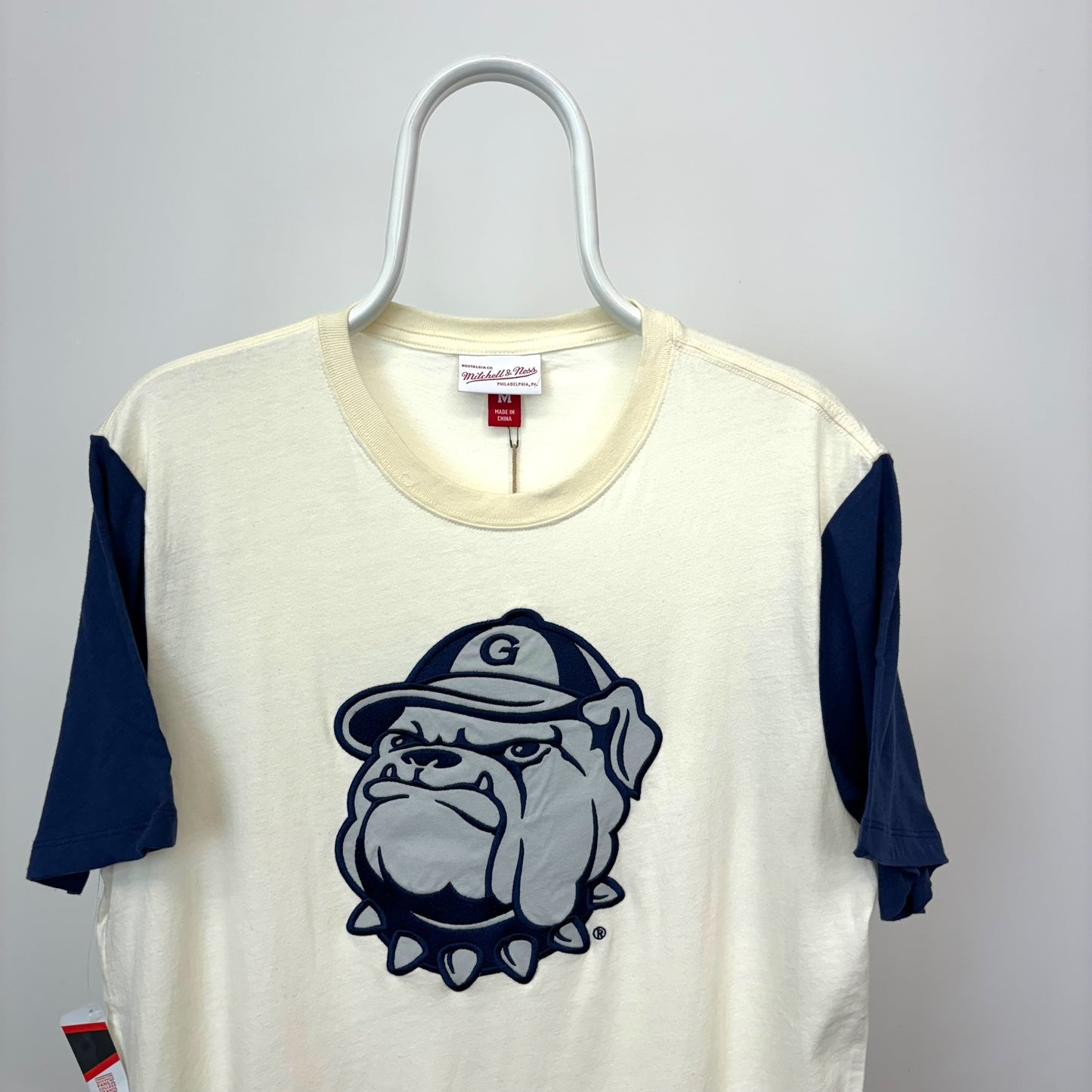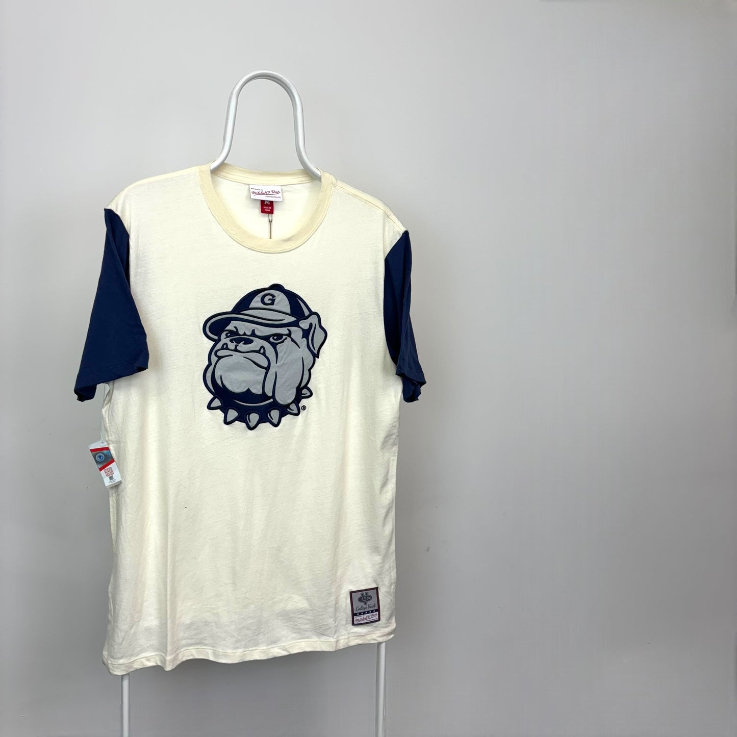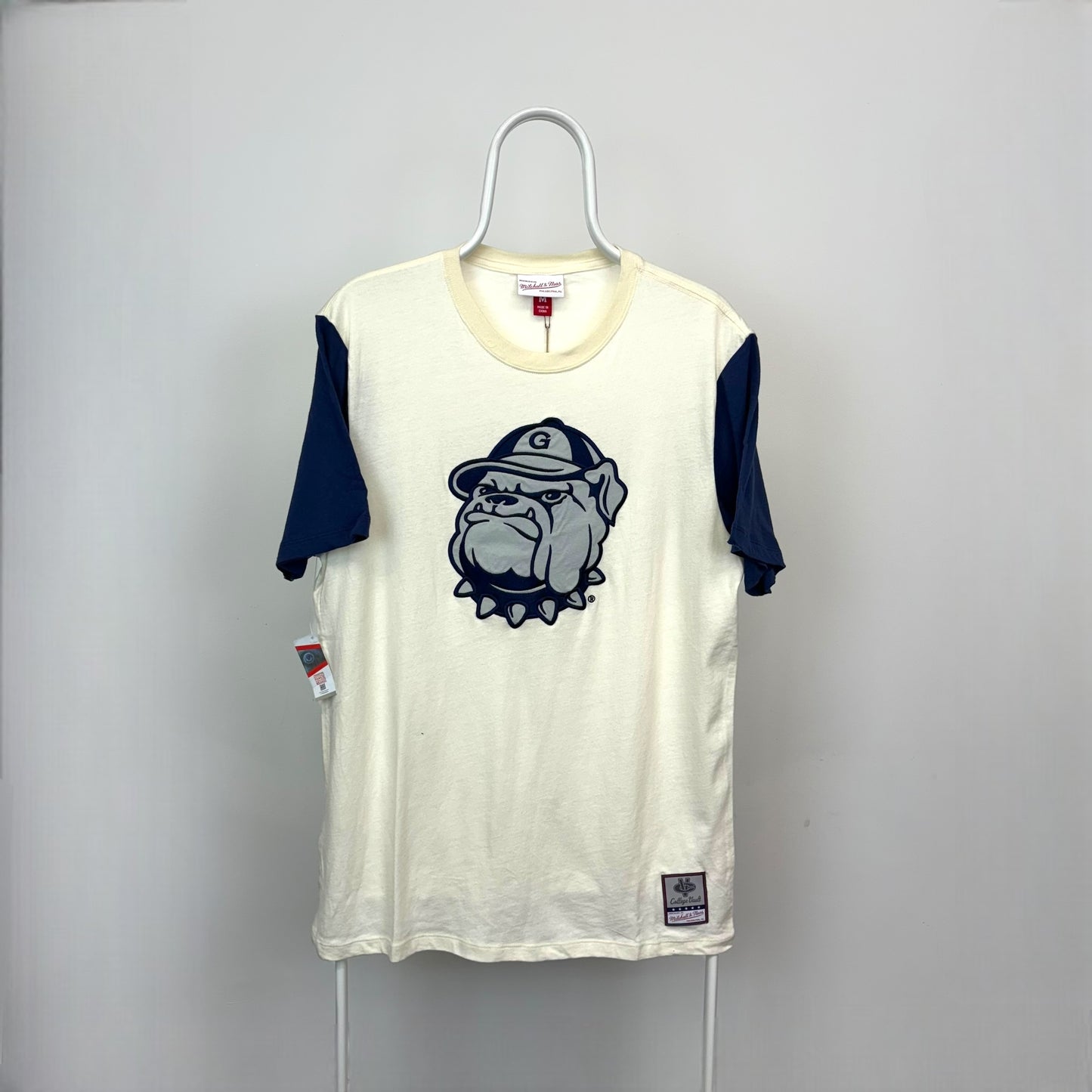 Embrace a timeless aesthetic and represent Georgetown with pride in this Mitchell & Ness Georgetown Hoyas Colorblocked Embroidered T-Shirt. This premium garment transcends mere fan gear, becoming a symbol of your unwavering Hoya spirit and a conversation starter for fellow Georgetown enthusiasts. Expertly crafted from a comfortable cotton blend, it features a bold colorblock design with a crisp cream body and contrasting navy blue sleeves. The centerpiece is an undeniably Hoya statement: a large, meticulously embroidered Georgetown logo prominently displayed on the front. This t-shirt offers a perfect blend of comfort, style, and collegiate pride, allowing you to rep the Hoyas in ultimate comfort.