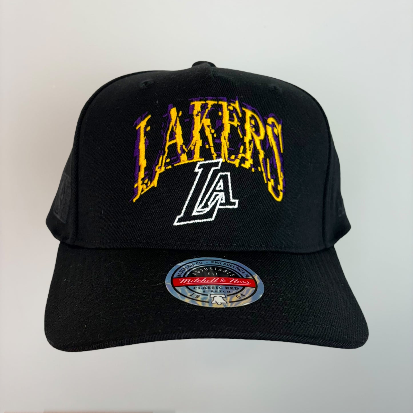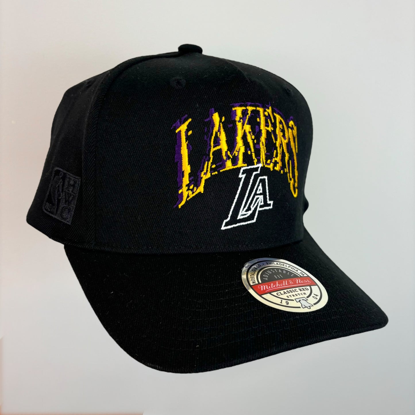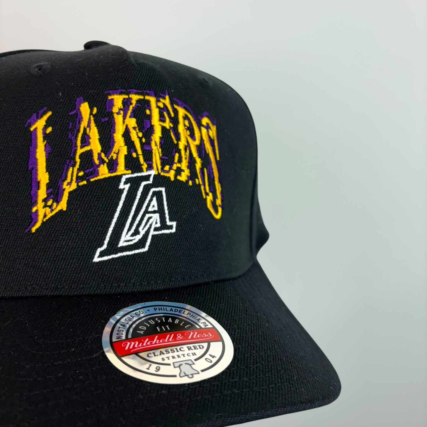 Make a statement with the Mitchell & Ness Los Angeles Lakers Suga Glitch Snapback Hat. This black snapback, featuring a unique 'Suga Glitch' inspired embroidered Lakers wordmark, is a fusion of classic team pride and contemporary design. Mitchell & Ness, known for their attention to detail, delivers a high-quality hat that captures the essence of modern streetwear with a nod to Lakers legacy.