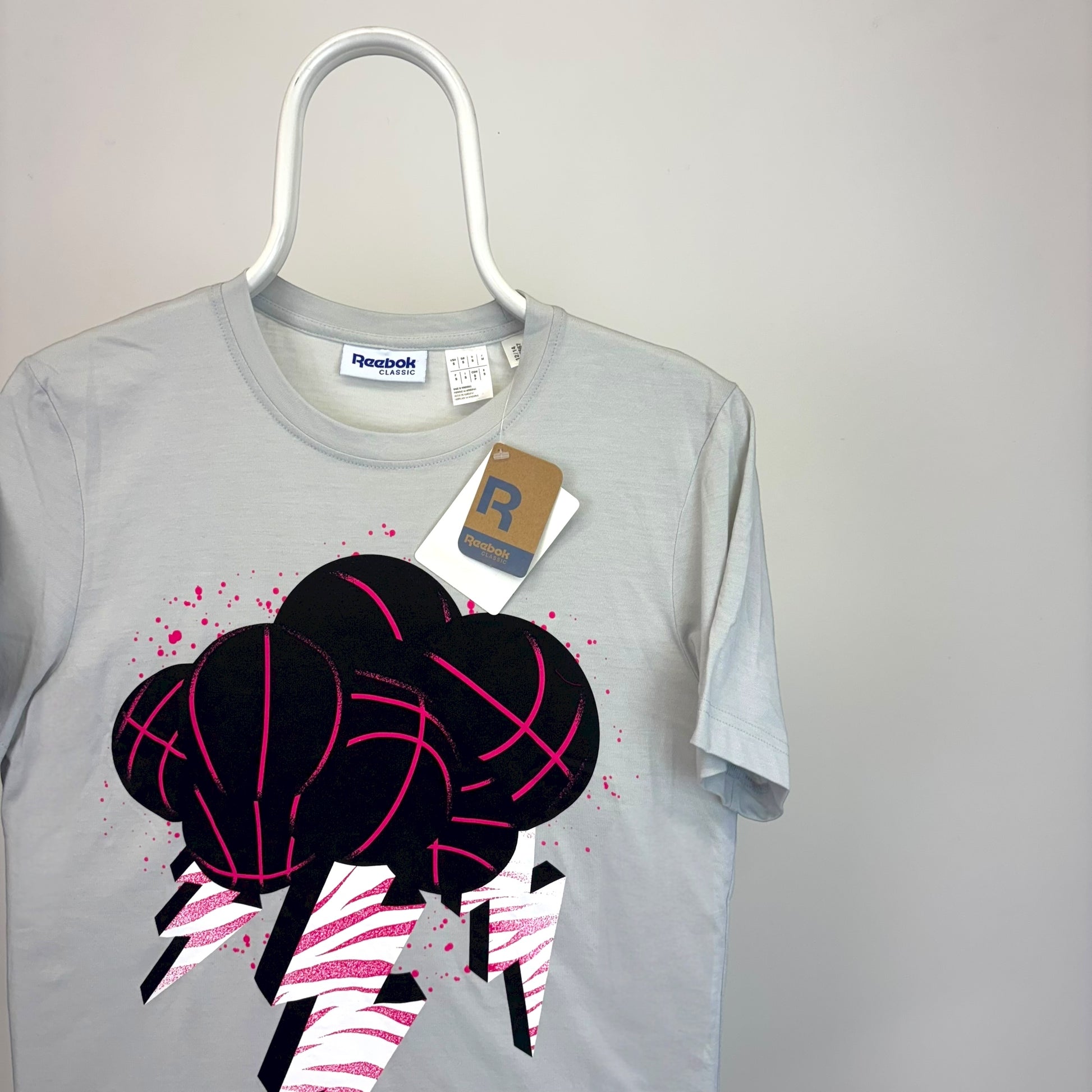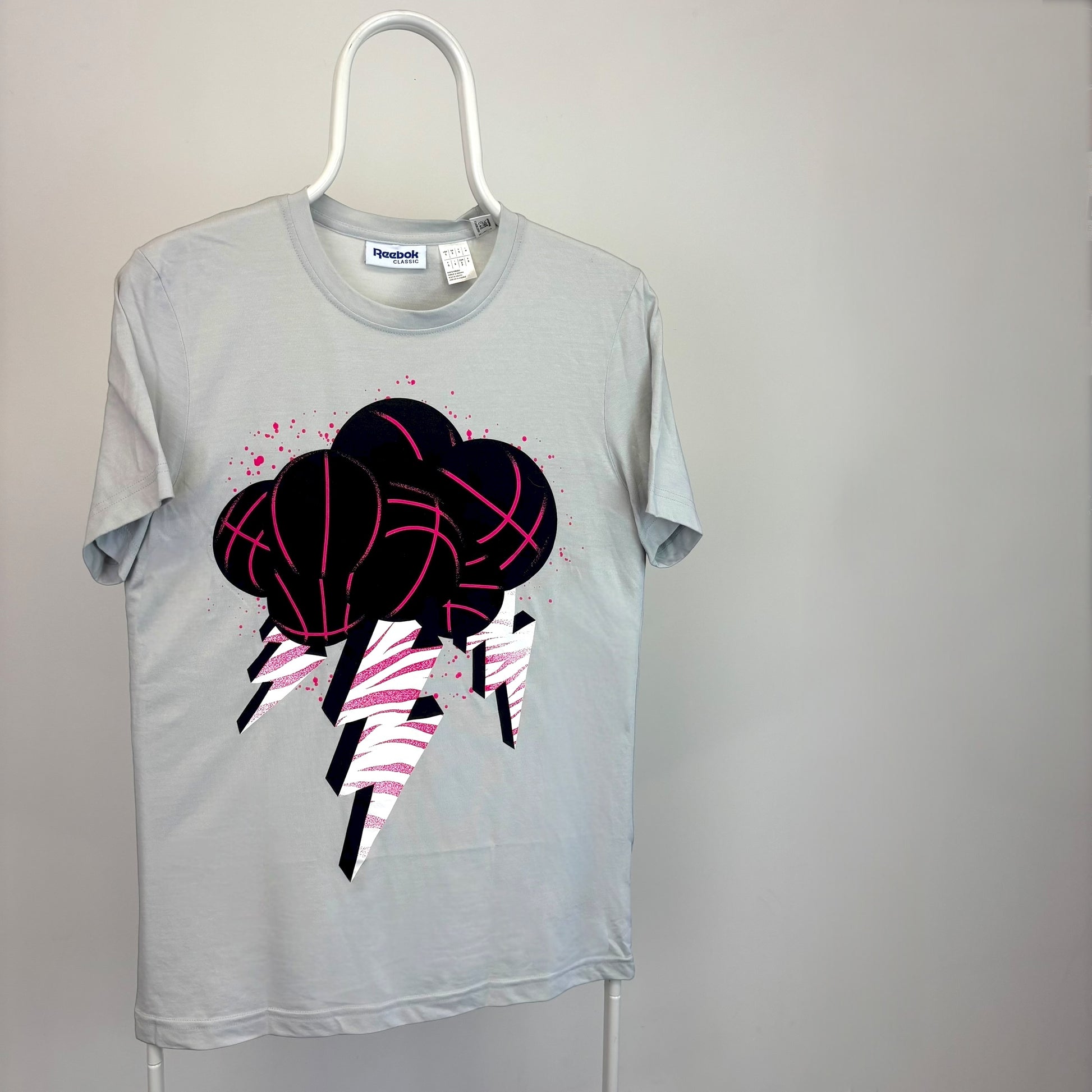 Bring energy to your look with the Reebok Basketball Graphic T-Shirt. Styled in versatile grey, this tee features a dynamic graphic of basketballs forming a storm cloud with lightning striking beneath—a bold design that captures the intensity of the game. Perfect for on or off the court, it’s a standout piece for basketball fans who like their style with impact.